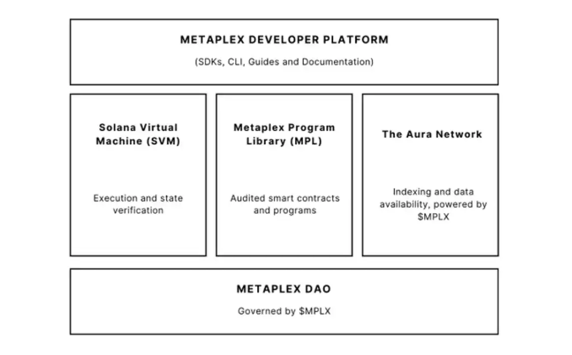 Metaplex 目前由 Metaplex Developer Platform、SVM、MLP、Aura 网络和 Metaplex DAO 组成,具体信息包括: