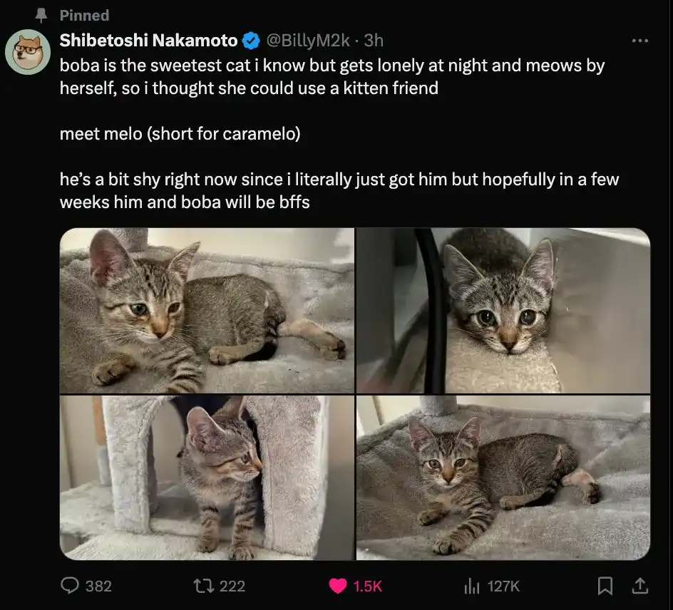 melo 是狗狗币的联合创始人 Billy Markus 的新猫,团队甚至为这个 meme 币准备了一篇Medium 文章。