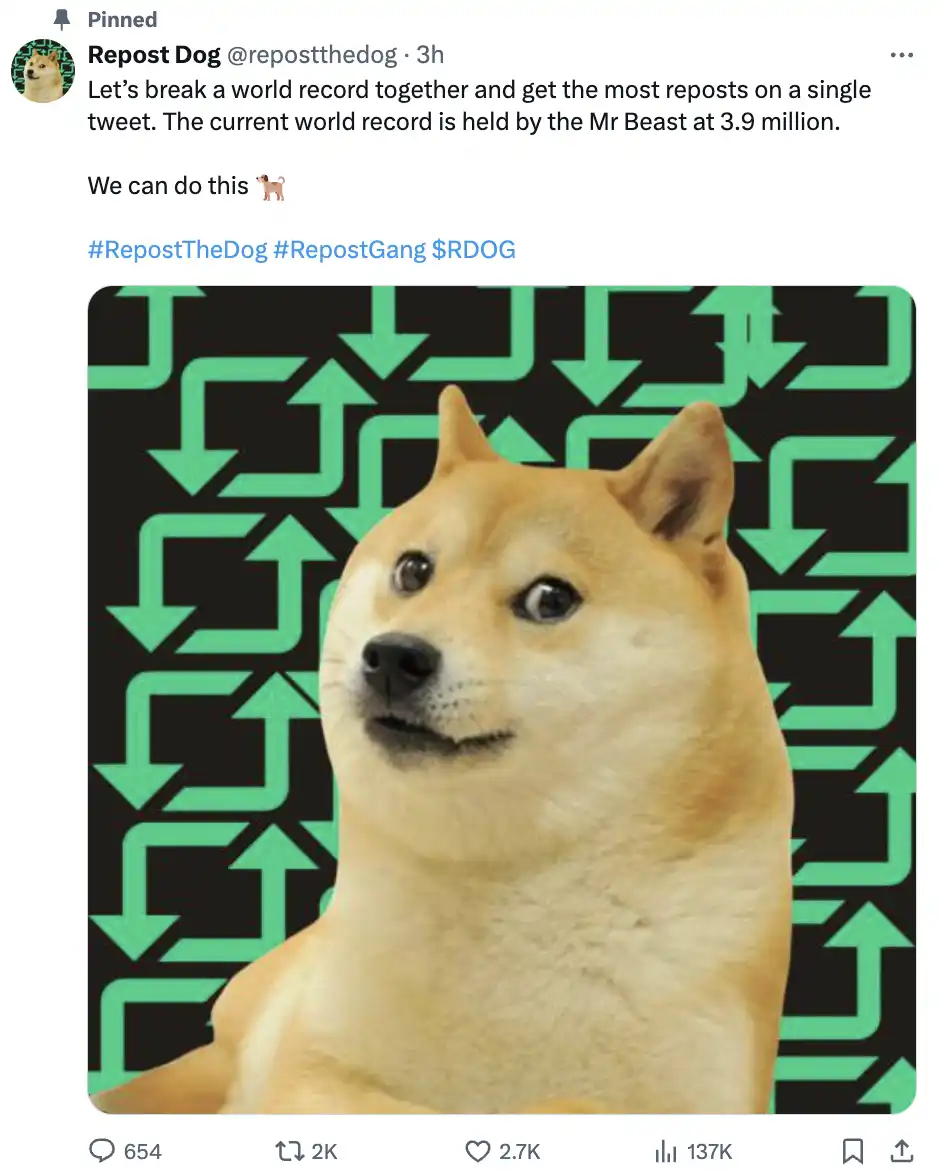 RDOG(Repost Dog)官推仅有一条推文,号称希望该条推文成为世界上转发量最多的单条推文,打破吉尼斯世界纪录(390 万次)。目前这条推文的转发量刚超过 2000 次。