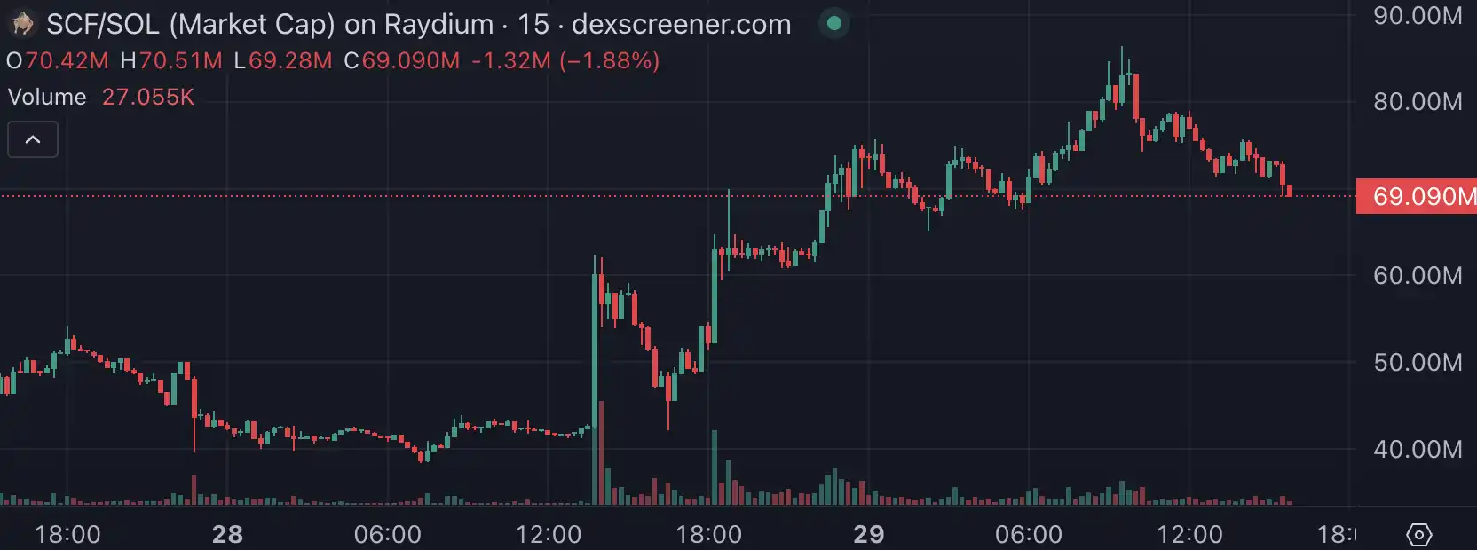 被Arthur Hayes在昨日喊单后,SCF 24小时涨幅108%,交易量超1500万美元。但从今日上午开始转为下跌,目前已经距高点回调16%。