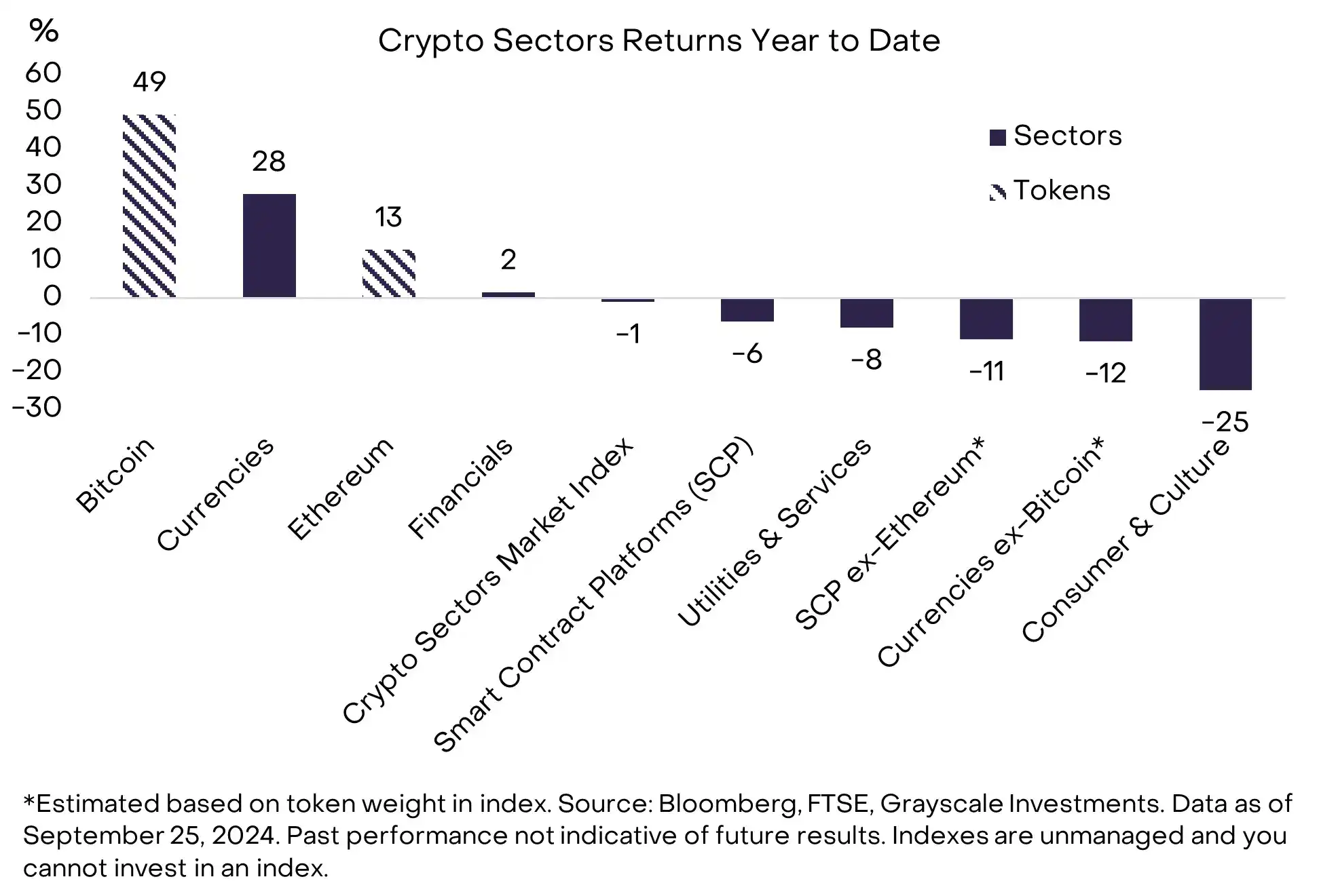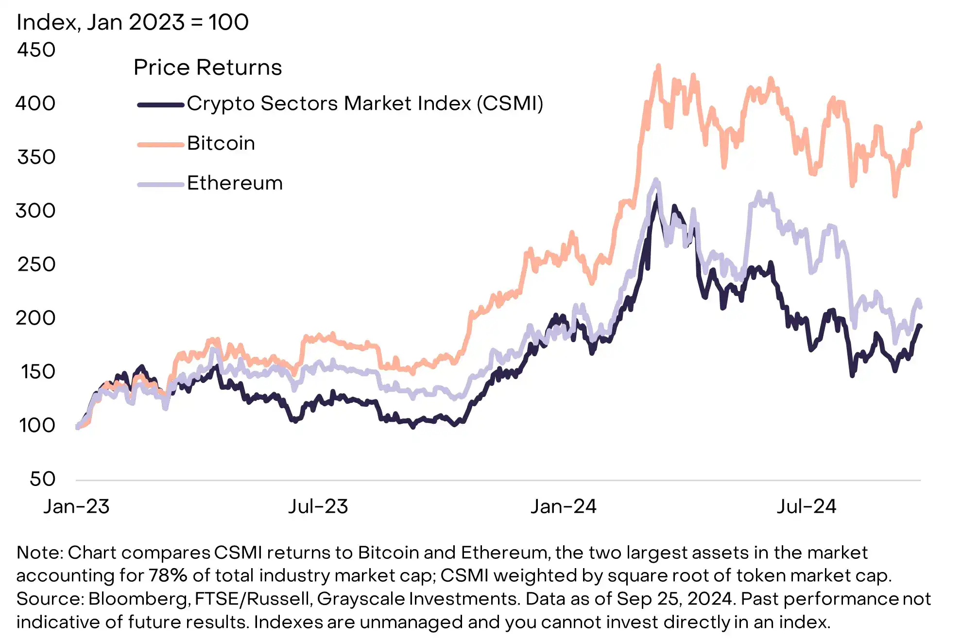 · 根据 FTSE/Grayscale 加密行业指数,加密市场在 2024 年第三季度横盘整理。