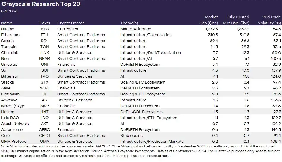 · Grayscale Research 汇总的前 20 名代币已经更新。前 20 名代表了加密行业的多元化资产组合。这些资产在未来一个季度具有很高的潜力。本季度新增资产为 SUI、TAO、OP、HNT、CELO 和 UMA。