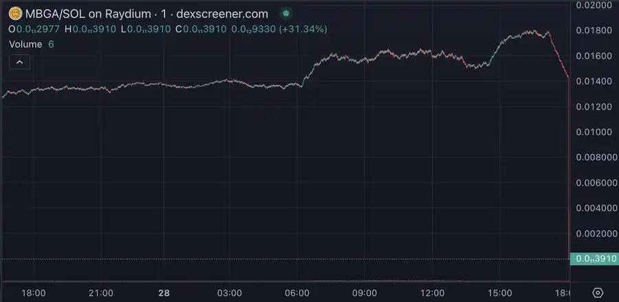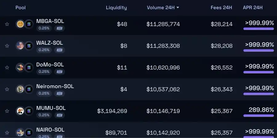 每一个低流动性的资金池项目,都在过去 24 小时内出现了跑路现象。以 MBGA 为例,在过去的 24 小时里,共有 46,000 笔交易,交易量达到 1,080 万美元,2,845 个独立钱包参与买卖,并在 Raydium 上生成了超过 28,000 美元的手续费。(作为对比,一个类似规模的合法流动性池 $MEW,只生成了 11,200 笔交易)