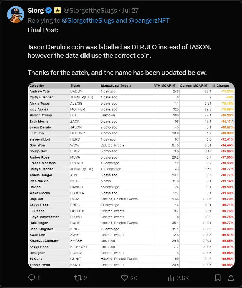 除了跑路和 MEV,零售市场的前景仍然黯淡。名人们选择了 Solana 作为他们的首选链,但结果并不理想: