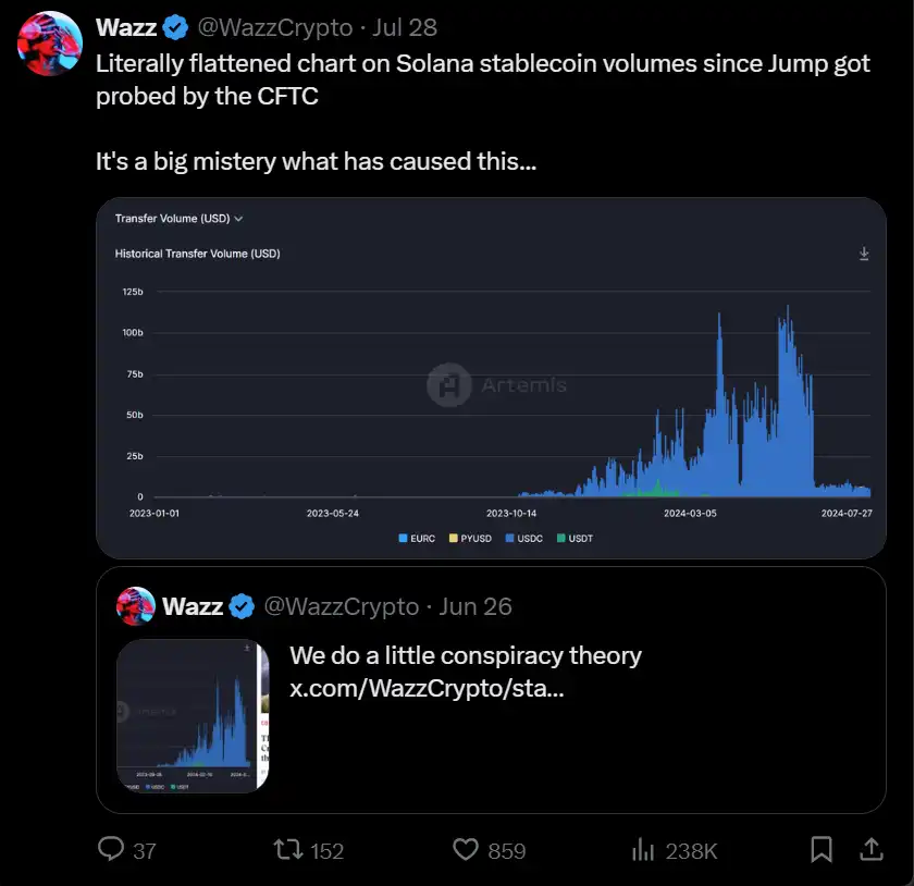 稳定币交易量的动态进一步强调了这一点——@WazzCrypto 指出,当 CFTC 宣布正在调查 Jump 时,交易量突然下降。