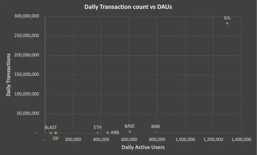 从表面上看,SOL 的数据非常亮眼,日活跃用户(DAUs)超过 130 万,而 ETH 仅为 376,300。然而,当我将交易数量纳入考量时,发现了些奇怪的现象。