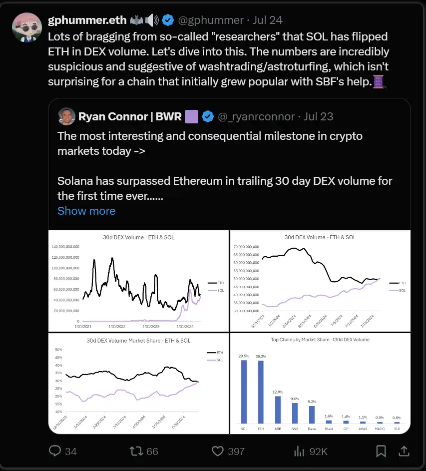 编者按:本文深刻的解释 Solana 的潜在问题,尽管其用户基数和交易量看似优于以太坊,但深入分析显示,大部分交易量可能源自刷量和跑路项目,导致虚假的繁荣。作者通过对用户活跃度、DEX 交易量、MEV 现象等的详细数据分析,指出 SOL 的指标被夸大,链上生态面临着严重的基本面问题。