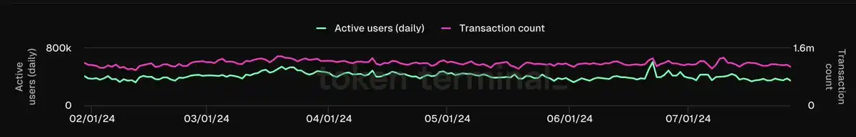 例如,7 月 26 日星期五,ETH 有 110 万笔交易,对应 376,300 DAUs,每个用户大约进行 2.92 笔日均交易。然而,SOL 的数据则是 2.822 亿笔交易,对应 130 万 DAUs,意味着每个用户每天平均进行 217 笔交易。