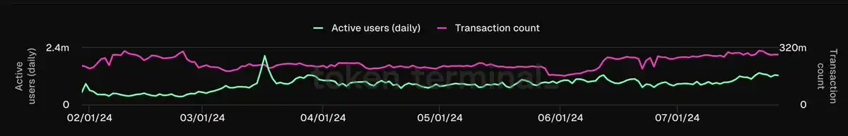 以下是 ETH 主网与 SOL 的用户基数对比(仅比较主网数据,因为在 Dencun 升级后,ETH 大部分手续费来源于主网,数据来源:@tokenterminal):