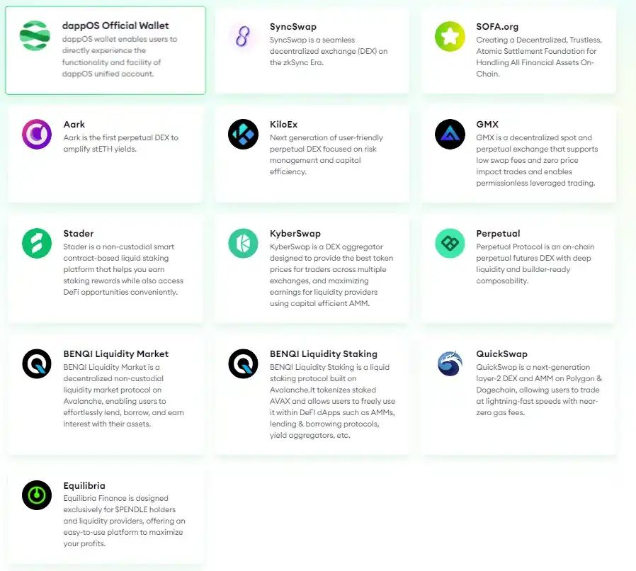 自 dappOS V2 测试版发布以来,dappOS 已与 15 个以上的去中心化应用(dApp)集成,包括 GMX、Stader、KyberSwap、Equilibia、BENQI 和 SyncSwap。