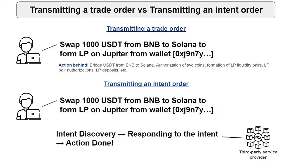 意图指的是用户的期望结果,而不考虑具体的执行步骤。例如,传统的以太坊交易方法要求用户明确每一步交易,包括与智能合约交互、管理随机性和支付 gas 费用,复杂且低效。意图的概念旨在减轻用户的负担,使他们能够将交易创建过程外包给第三方,同时保持对交易的控制权。