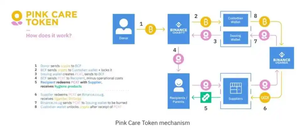 后来,我们还在 Binance Smart Chain(现 BNB chain)上发行了全球第一个(可能也是至今唯一一个)「价值稳定币」:粉红币(Pink Care Token),和其他稳定币不同的是,粉红币不和任何法币「价格」挂钩,而是以物品价值挂钩:每一枚粉红币,与一个女孩在乌干达使用一年的卫生巾的「价值」挂钩。这个项目的起源,是因为在当地发土豆白菜的时候,和当地人聊天,发现「月经羞耻」仍广泛存在在当地女性群体,由于平时缺乏性教育,也由于卫生巾价格昂贵难以购入,经期用树叶草皮取代卫生巾,造成严重妇科问题,而很多女孩 14 岁就要结婚生子,过早的怀孕又雪上加霜,直接造成很多女孩在生育中死于感染。拿到粉红币的女孩,都可以去和我们合作的环保卫生巾供应商那里「兑换」一年的卫生巾。