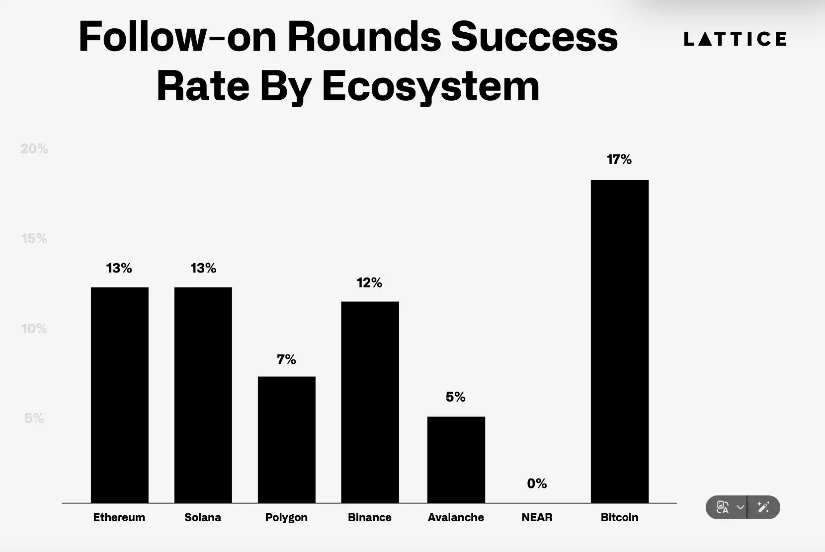 2022 年种子阶段团队的失败率与 2021 年团队保持一致,但各个生态系统内出现了显着差异。正如去年所观察到的,Binance 生态系统内的团队最容易关闭,现在 Avalanche 生态系统中的团队也加入了这一行列。值得注意的是,基于 Solana 的项目的失败率翻了一番,超过 25% 的团队停止运营。这一增长可能是由于牛市期间投机资本的涌入,导致 FTX 后 Solana 面临的特别具有挑战性的时期出现过度扩张和随后的损耗。然而,很明显,熬过这一困难阶段的团队已经得到了回报。此外,值得强调的是比特币生态系统团队的弹性,他们不仅继续交付,而且表现出非凡的持久性,反映了比特币网络本身的可靠性。