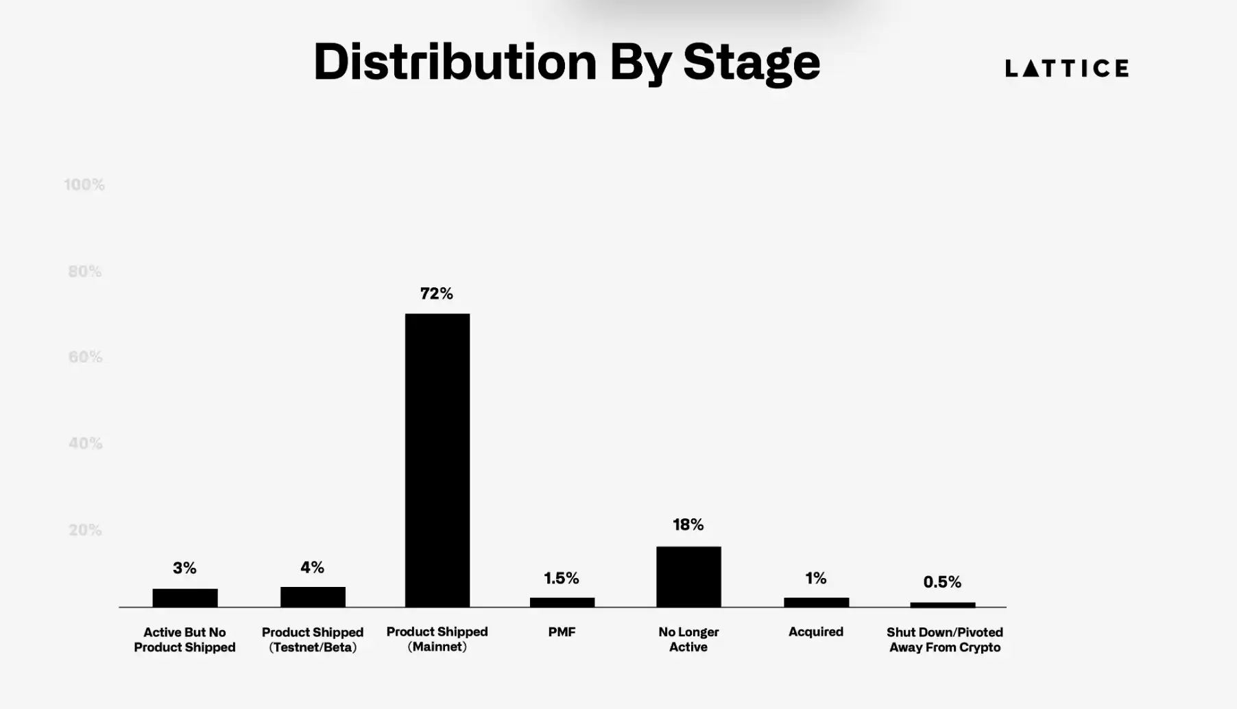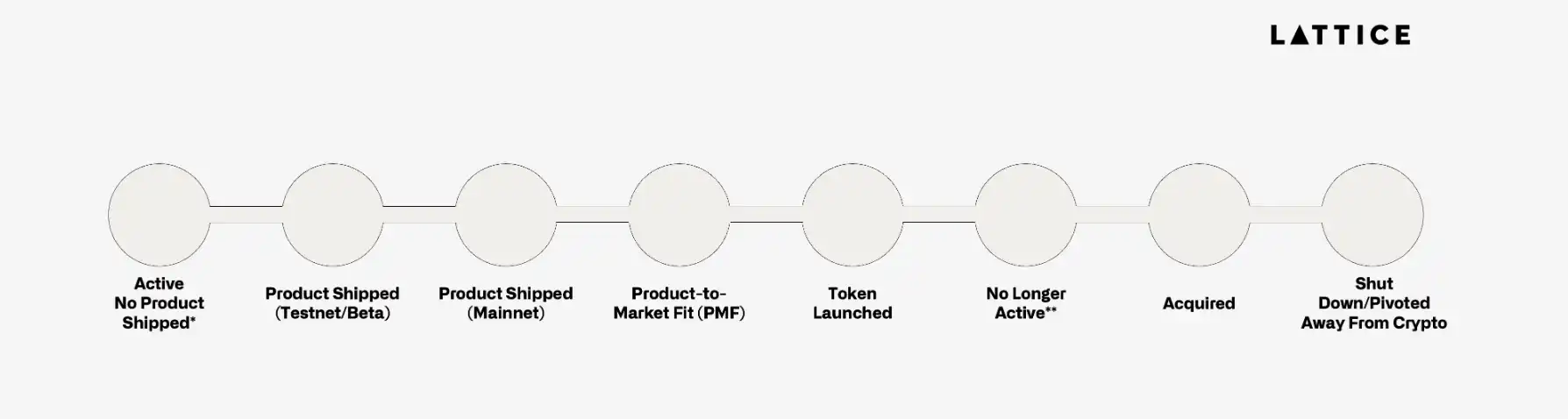 (注:Lattice 的配图,将从左到右将被分析的产品分为活跃但未交付、产品交付、有 PMF、有代币、不再活跃、被收购和关停等几个阶段)