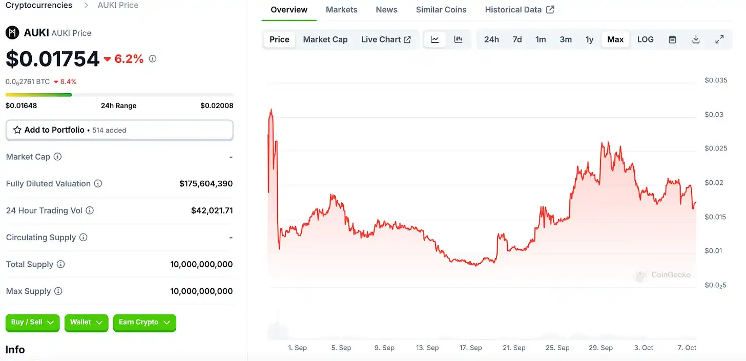 让我们来看看 Auki Labs 在发行代币时做了什么不同的尝试。上面是来自 CoinGecko 的截图。正如你所看到的,Auki 的 FDV 和 24 小时交易量都相对较低。这是因为它首先在 DEX 上上市,随后才在 MEXC 的 CEX 上市。到目前为止,Auki 的代币价格比上一轮私募价格上涨了 78%。
