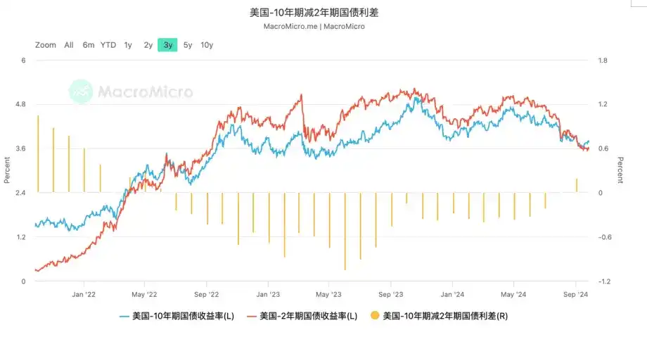 伴随降息,美债市场亦出现趋势性改变。对美国经济长期发展的忧虑,导致 2 年期国债收益率自 2022 年 7 月起长期高于 10 年期国债。这一趋势在刚刚过去的 9 月得以扭转,目前 10 年期与 2 年期国债息差已经回正达到 0.16。这意味着国债投资者初步完成对美国经济「软着陆」的确认。