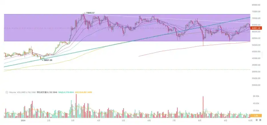 64000、66000、70000、73000 美元是短线重点关注价格,分别代表短线成本压制、下降趋势线压制、上升趋势线反转压制和新高压制。本月对已经呈现下降偏移的 200 天均线的突破具有较大意义,这个 64000 美元的价格也是短线成本价和 8 月反弹的高点。这个关口的「有效」攻克非常重要,之后便是 66000 美元和 70000 美元的突破。目前 4 个关键价格位尚有 3 个没有突破,希望应在 BTC ETF 通道的资金身上。