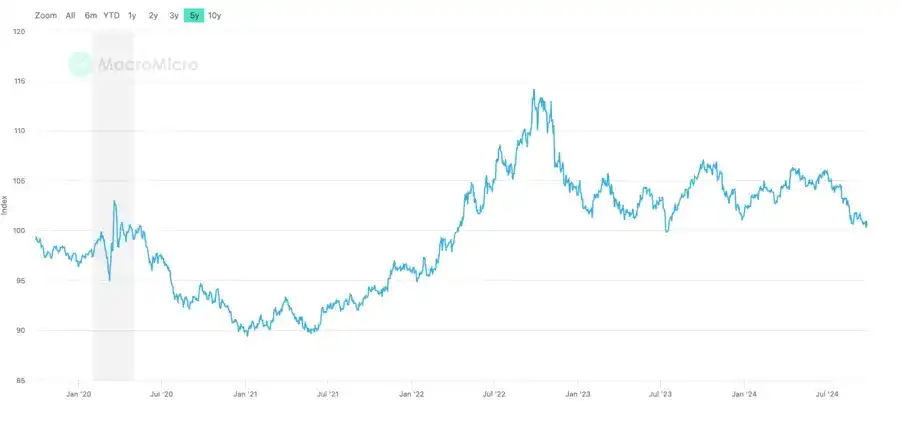 降息启动,美元指数略有反弹之后重回跌势,及至月底再次逼近 100 关口,回到 2022 年 4 月的点数。随着降息持续进行,跌破 100 或只是时间问题。
