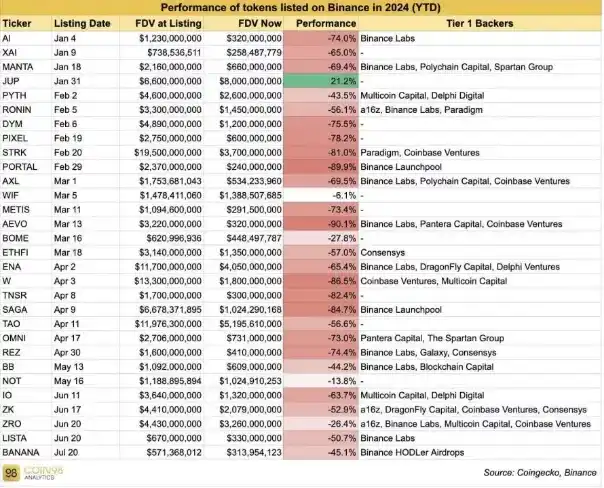 通过加密 KOL@Ryanqyz_hodl 统计的数据来看,2024 年在 Binance 上市的大多数代币,TGE 后全部大幅下跌。