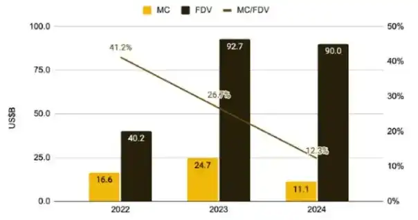Binance Research 在今年 5 月发布的报告中指出,2024 年前四个多月推出的代币 FDV 已经接近 2023 年的总数。且 2024 年推出的代币市值(MC)与 FDV 比率是最低的,约为 12.3%。而 2022 年和 2023 年的代币 MC/FDV 比率分别为 41.2% 和 26.7%。