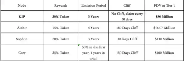 而根据 KIP Protocol 此前节点销售模型来看,它通过在销售开始时引入较低级别的节点,为早期参与者提供较低的潜在 FDV。KIP 拿出代币总量的 20% 用于节点奖励,Tier 1 节点对应的估值也在 5000 万美元,远低于 Aethir、Sophon、Carv 等项目的 Tier 1 节点对应的估值。