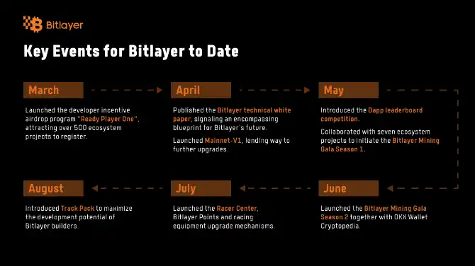 自创立以来,Bitlayer 致力于最前沿的 BitVM 和 OP_CAT 研究与开发,专注于探索比特币的潜力,并通过技术创新将可编程引入比特币系统,并专注于生态建设与用户获取。截止目前,Bitlayer 的关键里程碑事件包括: