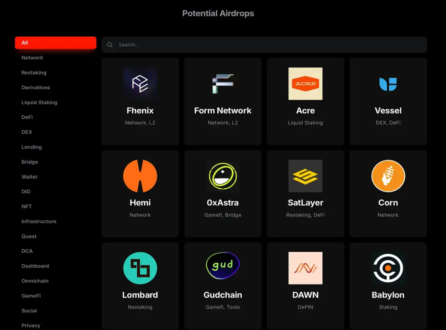 Alpha Drops 是一个方便的平台,用于跟踪各个 Web3 领域的空投。它提供用户友好的筛选器,允许您按领域选择项目。每个项目页面提供有关可用任务、资金指标和项目阶段的详细信息,无论是处于测试网还是主网阶段。