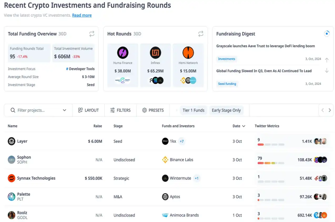 Crypto Fundraising 是一个宝贵的资源,跟踪最新的融资轮、事件和新闻。它提供尚未被其他分析平台覆盖的项目的信息。该网站还提供简单便捷的资金、投资者及其联系方式列表。