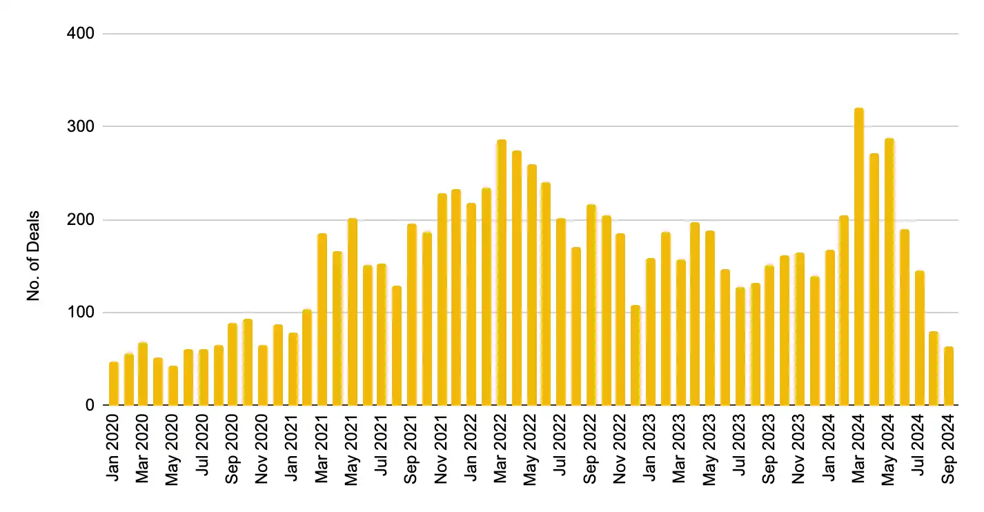 图 1:风险投资交易活动(以月度交易笔数衡量)跌至四年来的最低水平