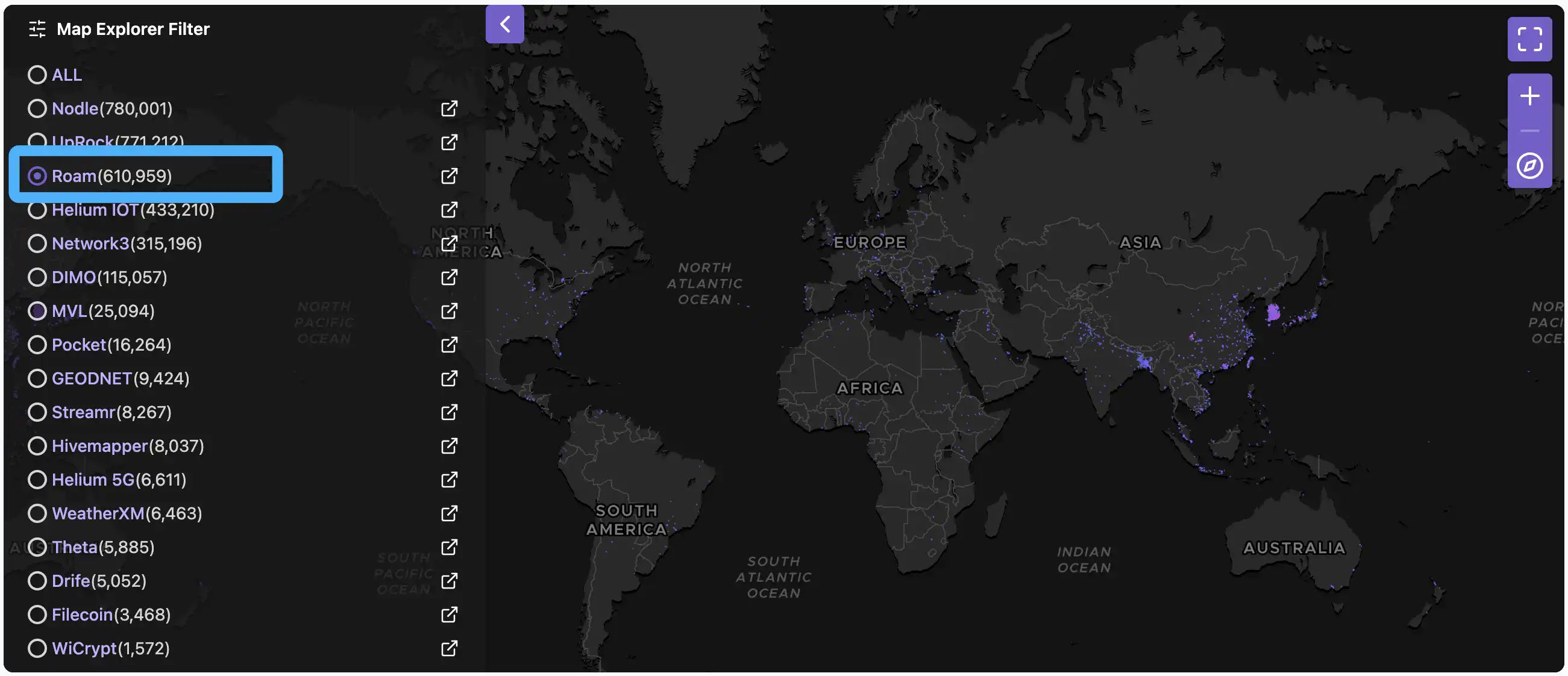 Roam 能够提出做「数据层」定位,首先来自于其在 DePIN 市场上的规模化优势,在 DePINscan 上,Roam 的节点数量已经突破 60 万个,在 DePIN 项目中排名第三,超过了 Helium、Hivemapper 和 DIMO 等曾经的明星项目。