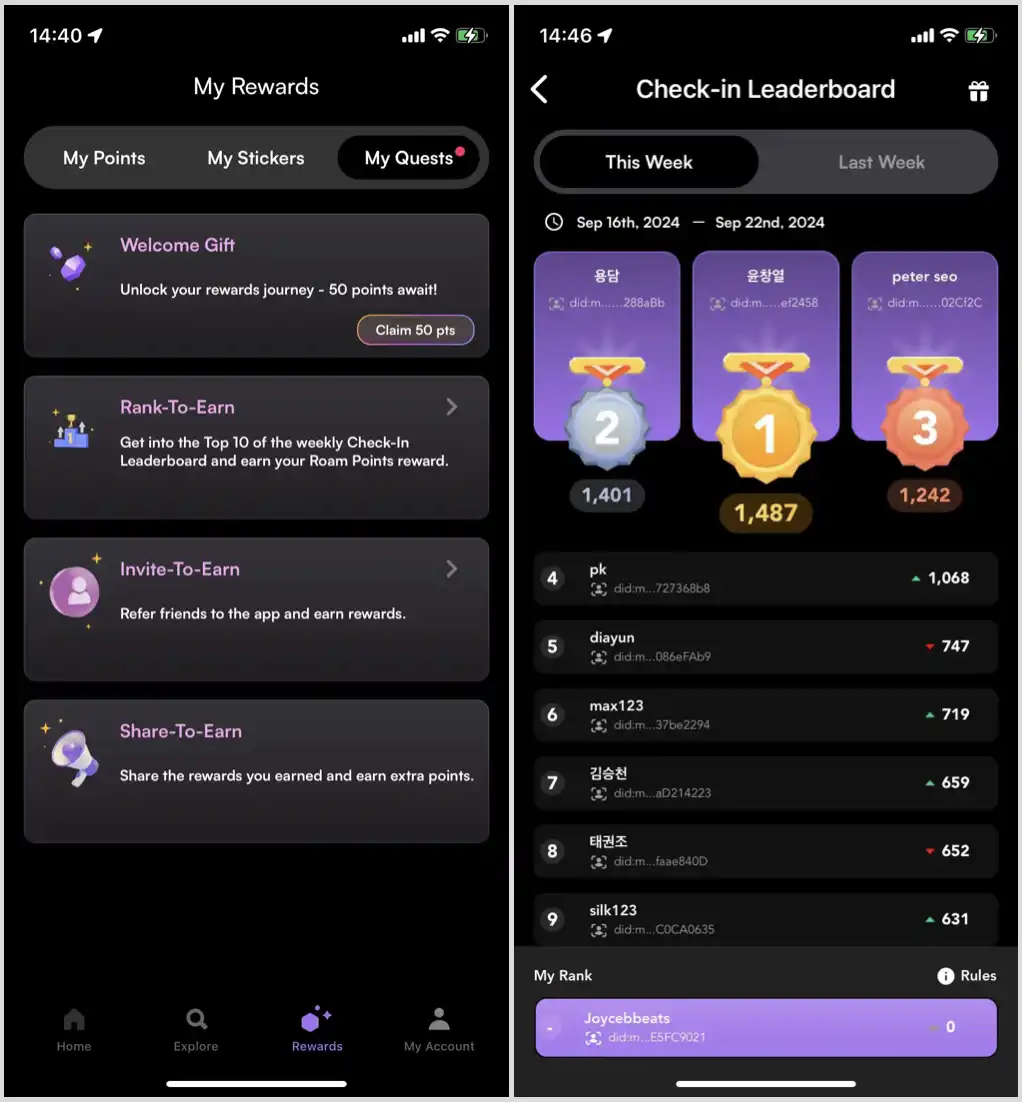 Roam 应用程序于 2023 年 6 月上线,用户只需下载应用程序、系统会自动帮助用户创建 DID,并配置安装 OpenRoaming 凭据,随后用户即可开始无缝漫游到全球任何 OpenRoaming 网络以及 Roam 自建的 WiFi 网络。用户可以根据不同的方式参与 Roam 网络建设并获得相应奖励(Roam Points),这些积分代币将在 TGE 之后可以燃烧为$ROAM 代币。目前,Roma 应用程序注册用户超过 75 万。