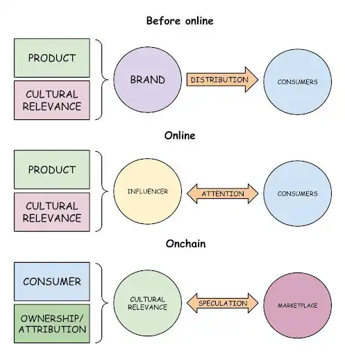 我们通常喜欢从「捆绑/解捆绑」的框架出发,思考新产品和技术采用的浪潮。在 2023 年 9 月,在 meme 币狂潮爆发之前,我们提出了一个模型,并指出:「或许这不太直观,但文化相关性将被交易。」