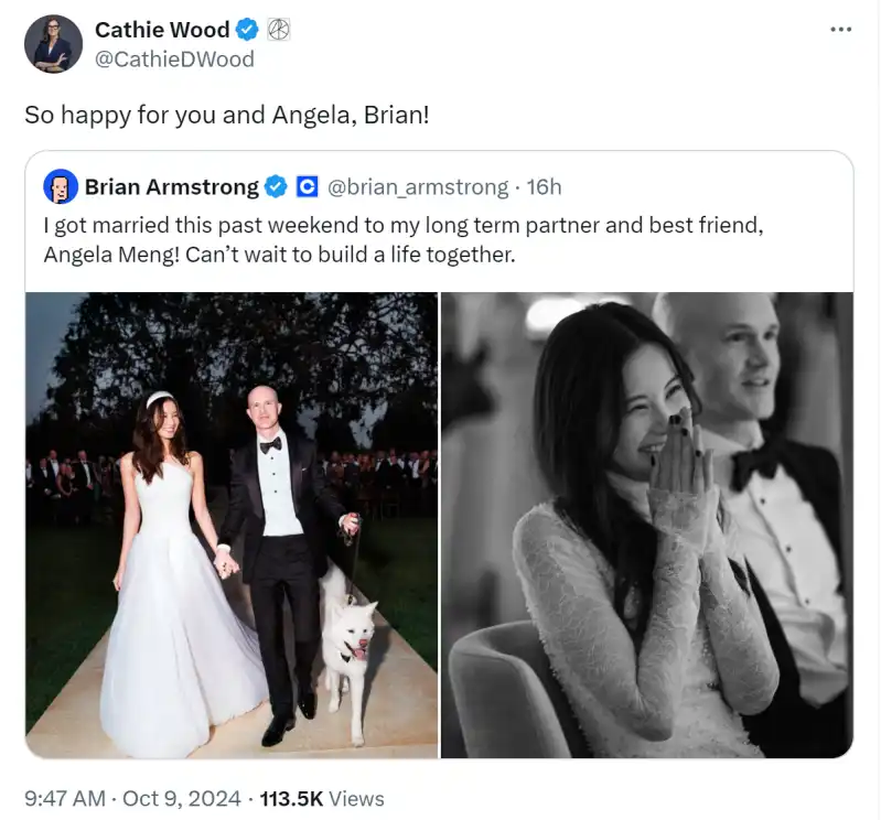 在加密行业,婚姻的消息也能掀起一场讨论,尤其当主角是全球最知名的加密货币交易平台 Coinbase 的联合创始人兼首席执行官 Brian Armstrong。近日,Brian 在社交平台上宣布与已 Angela Meng 结婚一周,这一消息迅速引发了加密社区的热烈讨论。来自全球加密领域的知名人物纷纷送上祝福,Ark Invest 的 Cathie Wood(「木头姐」)和 MicroStrategy 创始人都对这对新婚夫妇表达了诚挚的祝贺。
