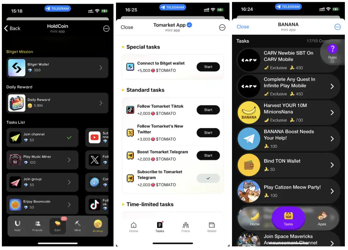 在 Telegram TON 生态中,流量售卖已成为一种高效且直接的变现策略。Holdcoin、Tomarket 和 Banana 等等是这一模式的代表,其通过售卖 Telegram 频道的用户流量,每天运作多个项目并产生可观的收入。根据购买用户的数量、质量以及地区分布,主流平台的单个用户售卖价格在 0.03 美元 至 0.1 美元 不等。这种模式不仅能快速获取现金流,还为中小型项目提供了便捷的用户获取途径。