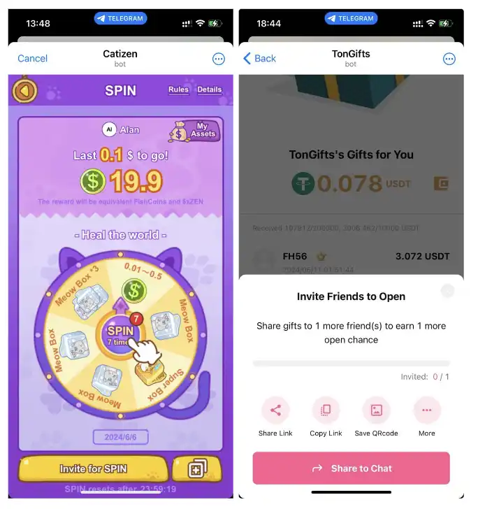 · 概率博弈型:结合概率抽奖的裂变玩法,如拆红包、幸运大转盘、开盲盒等,典型项目包括 Catizen(猫猫养成)和 TonGifts(发红包),这类项目依靠社交网络快速扩散用户。