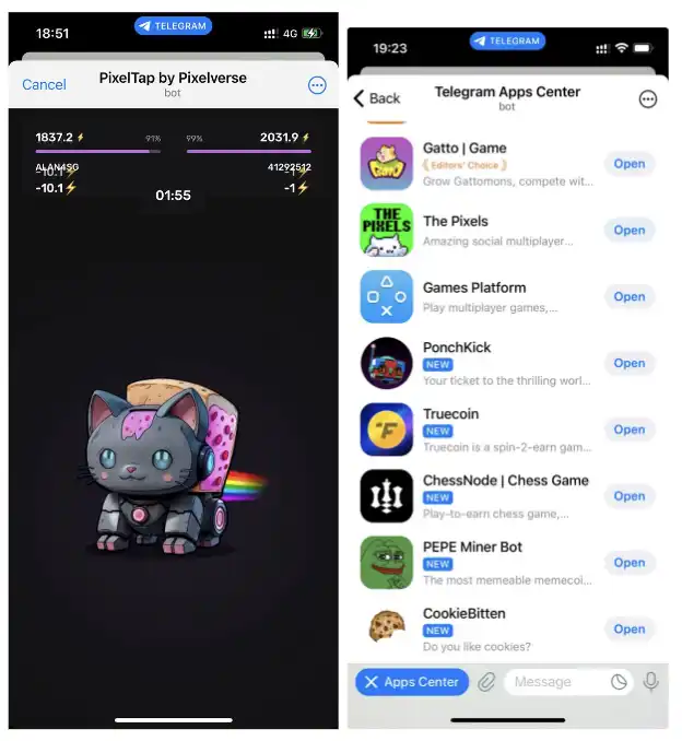 · 休闲游戏型:通过更复杂的游戏玩法和娱乐场景吸引用户,如 Catizen 和 PixelTap(机器人对战),这些休闲小游戏通过深度的用户互动增加了用户的粘性和参与度。