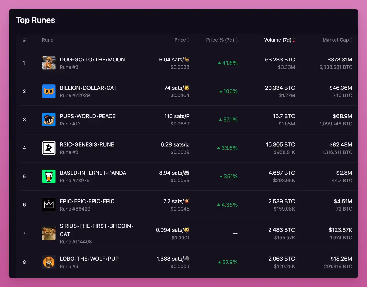 然而,我仍然相信 BTCfi 能够取得成功:基础设施在不断改善,社区也非常强大(主要在亚洲,所以在加密推特上较少被提及)。价格也在回升。可以看看 Rune 前 10 名的 7 天表现。