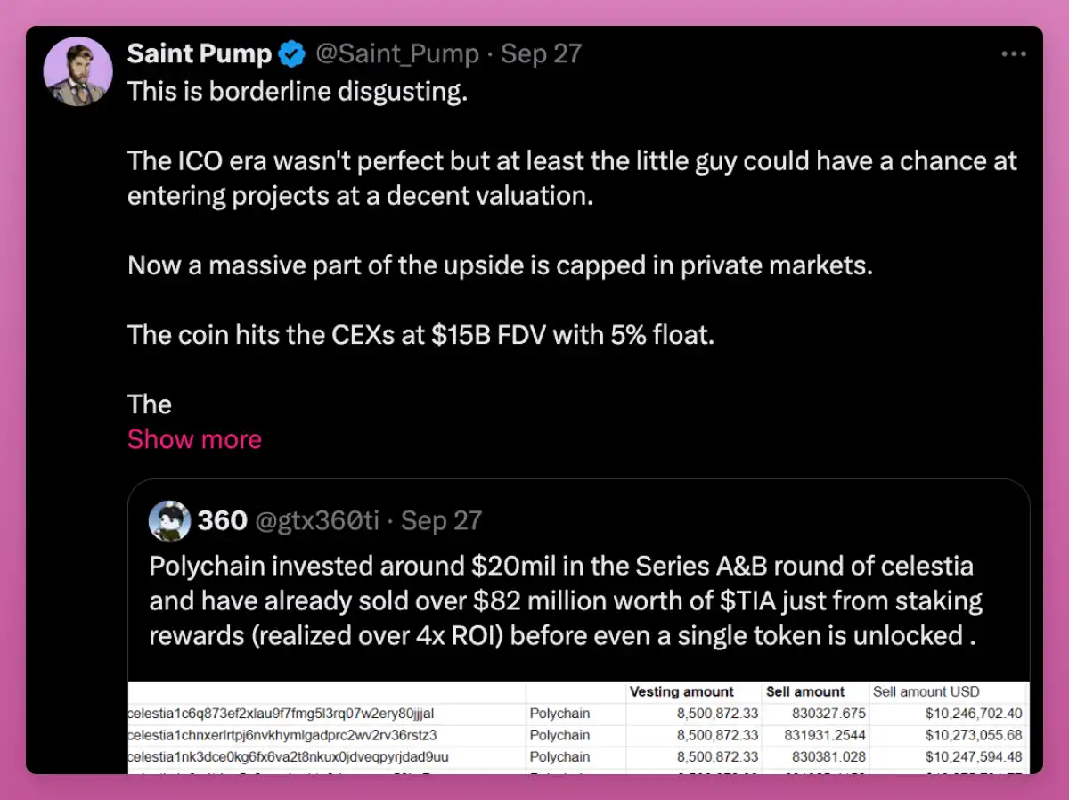 大多数价格发现发生在风险投资的私人融资轮中,这些投资者在代币公开上市前就以低价买入。因此,当这些代币进入市场时,它们的估值被高估,完全稀释估值 (FDV) 膨胀,留给公众投资者的利润空间很小。这种情况对内部人士有利,而公众买家则面临高风险、低回报的局面。