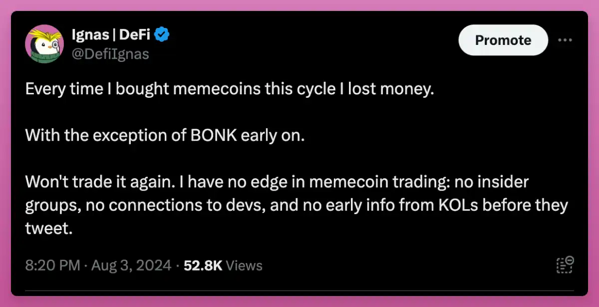 这也违背了我自己不参与 Memecoins 币交易的承诺。我不会买那些在 X 动态里被大量宣传的币,但我会在一些我相信有潜力的币上尝试一下。