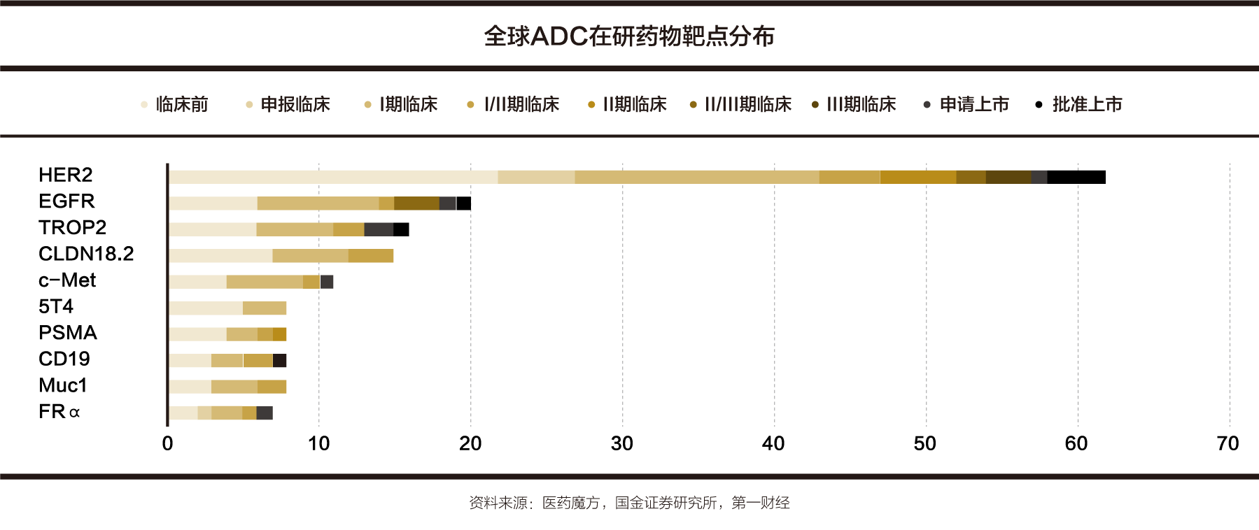 部分国内ADC药物的研发项目选择了靶点差异化的竞争策略,Claudin18.2、TROP2等靶点,以及一些HER2低表达适应症的研发项目日渐增多,并陆续获得突破。