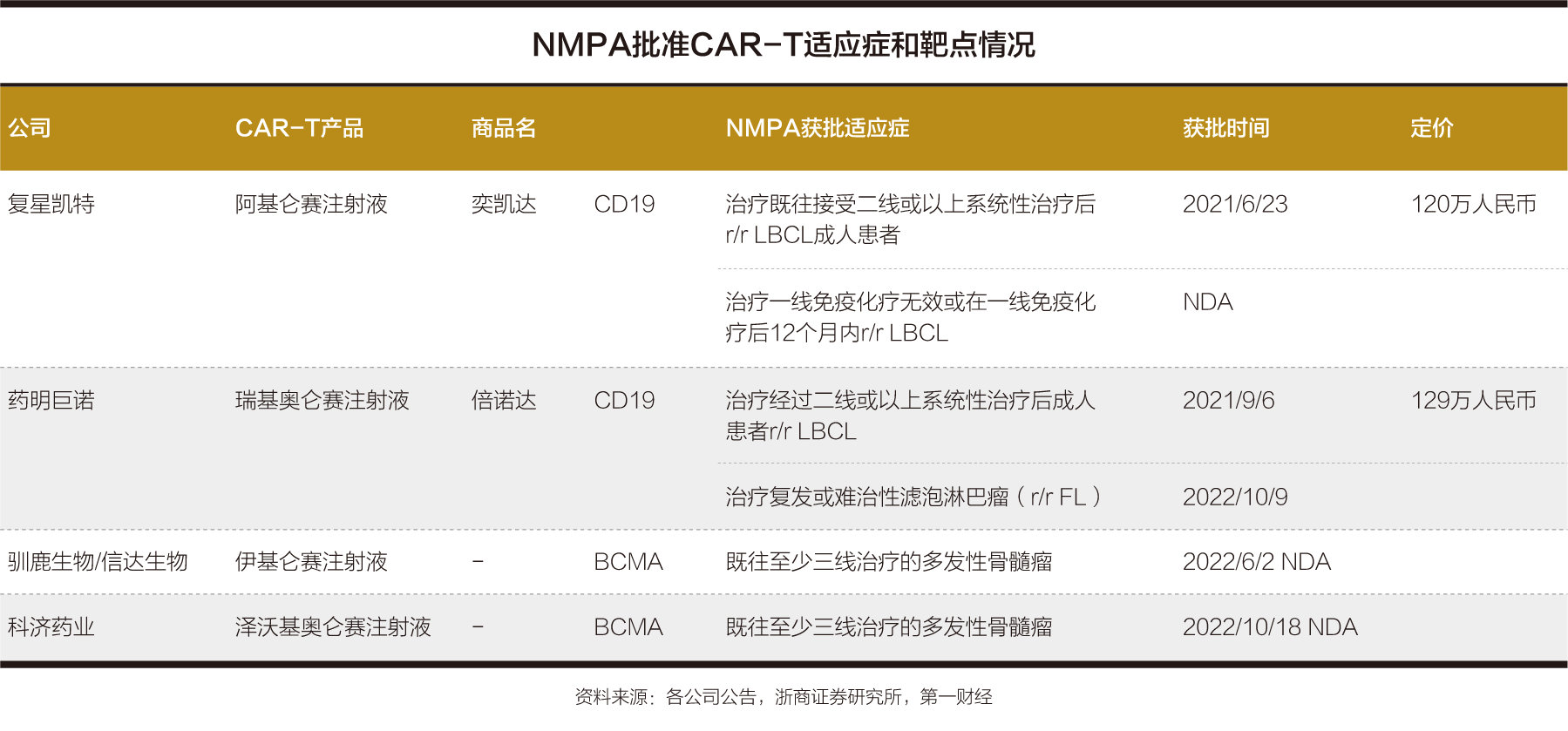 2021年,NMPA先后批准复星凯特的阿基仑赛注射液和药明巨诺(2126.HK)的瑞基奥仑赛注射液上市,两者成为国内首先获批的CAR-T细胞疗法产品。2022年3月,传奇生物西达基奥仑赛获批于美国上市,同年6月、10月,驯鹿生物/信达生物(1801.HK)的伊基仑赛注射液、科济药业泽沃基奥仑赛注射液先后申请在国内上市。