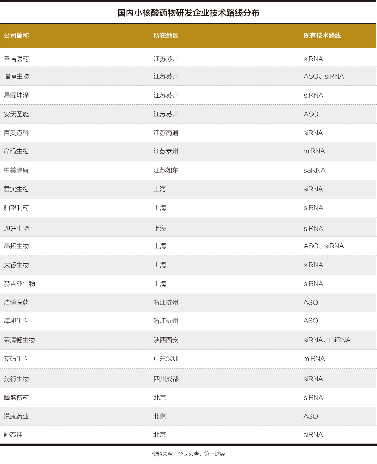 目前,据不完全统计,包括上市公司圣诺医药、腾盛博药(02137.HK)等在内,国内专注于小核酸药物研发的创新药企业近20家,此外,君实生物(688180.SH)、舒泰神(300204.SZ)以及悦康药业(688658.SH)等公司也纷纷涉足小核酸药物研究。从区域分布来看,长三角地区是国内小核酸企业的聚集地,其中,江苏更是小核酸药物企业最主要的分布地区。