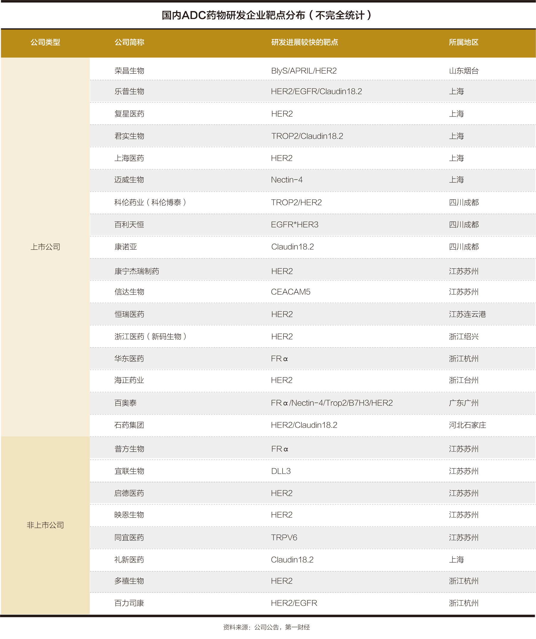 中国企业近年来在ADC药物研发方面的投入力度持续加大,并于2021年后陆续获得重大突破,技术水平逐渐在全球范围内获得认可。目前来看,布局ADC赛道的上市公司多为平台型生物制药企业,主要聚集于上海、成都、苏州等地,研究管线丰富,且进度相对靠前。