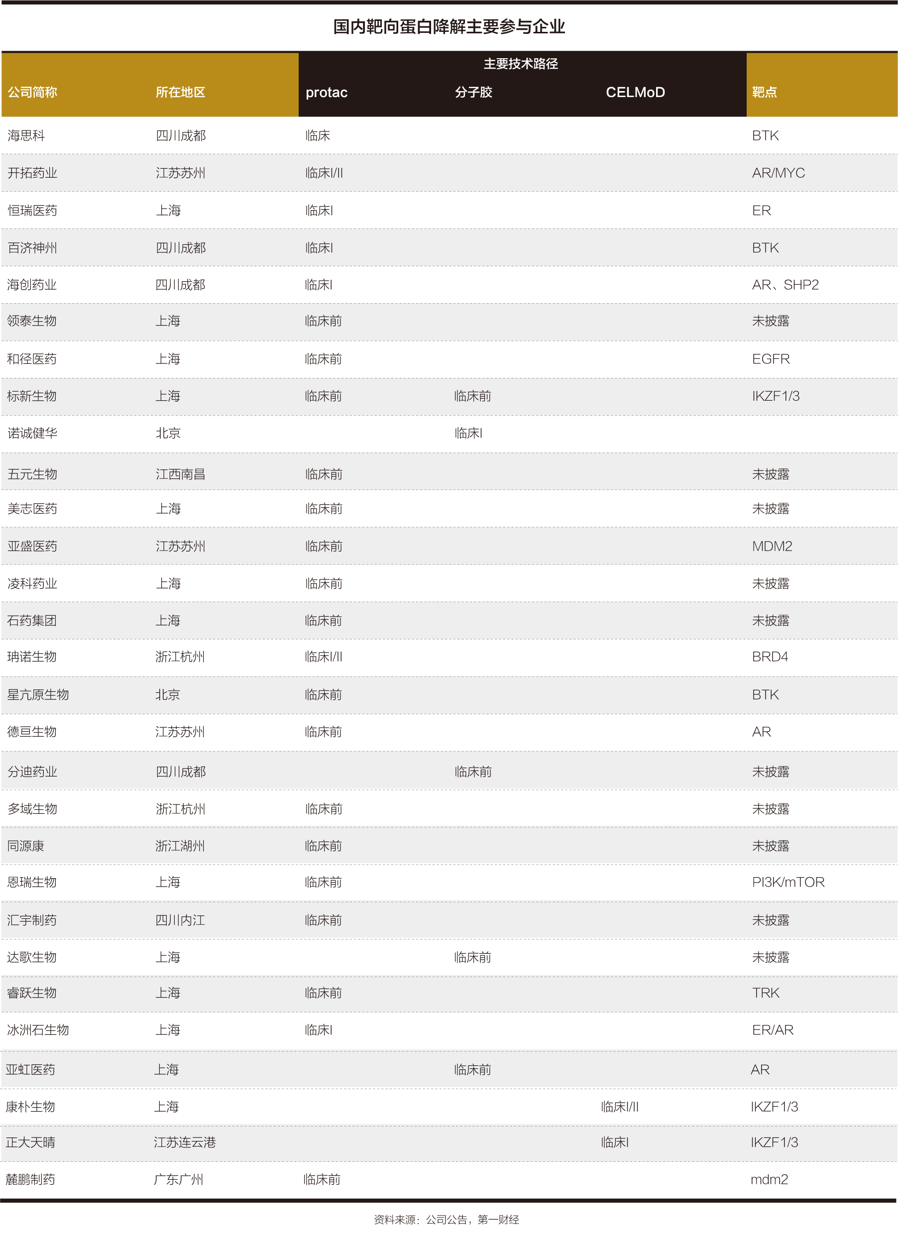 从技术路径和靶点分布来看,国内企业主要聚焦的技术路径依然是PROTAC,但也有越来越多的公司开始关注分子胶、CRBN E3连接酶调节剂(CELMoD)等技术路径,并取得了不同程度的进展。在针对靶点方面,以IKZF1/3、ER、AR、BTK等靶点居多。