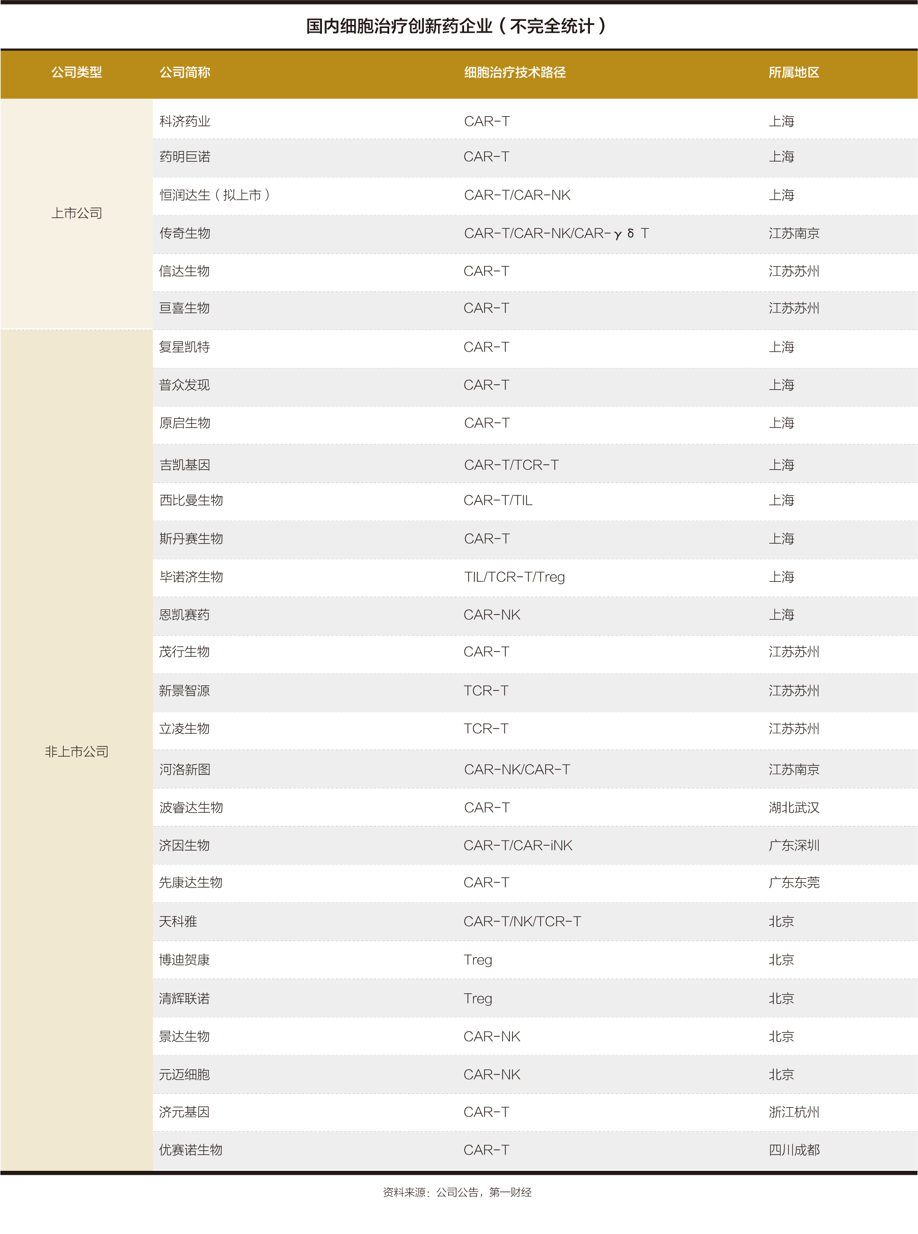 目前国内布局细胞治疗领域的企业众多,主要分布地区集中在上海、北京和江苏苏州。上市公司有科济药业、药明巨诺(02126.HK)、信达生物(01801.HK)、亘喜生物(GRCL.O)以及传奇生物(LEGN.O),此外恒润达生已披露招股说明书,有望成为首家在科创板上市的细胞治疗公司。
