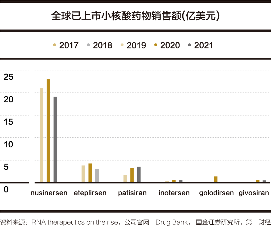 平安证券统计显示,截至2020年,全球小核酸药物销售额在35亿美元左右,其中销售额最高的是Ionis和Biogen合作开发的Spinraza(nusinersen),作为全球首款获批用于治疗脊髓性肌萎缩症的药物,其在2020年实现收入20.52亿美元。