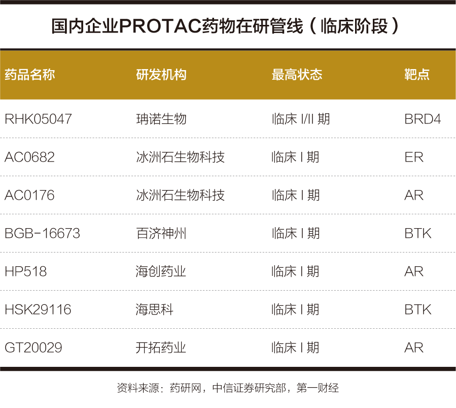 国内企业在蛋白降解药物领域的研究也已取得诸多进展,包括海创药业、开拓药业(09939.HK)、海思科(002563.SZ) 等药企在内,国内已有7款蛋白降解药物陆续进入临床研究阶段。