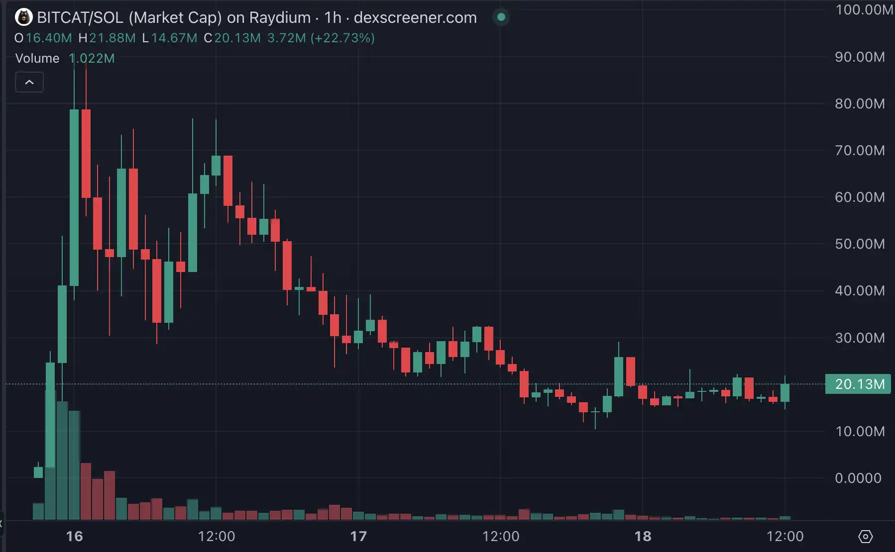由 BTC 官方推特号转发的比特猫图片,被市场认为是 BTC 吉祥物,上线之后迅速拉盘,短短四个小时市值接近 100M。