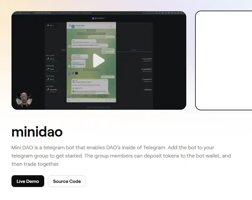 MiniDAO 是一个创新的 Telegram 机器人,让用户可以直接在 Telegram 群组中创建和管理 DAO 组织。该项目在 ETHGlobal Bangkok 黑客松中获得了 Blockscout Explorer 大奖池奖励,通过简化 DAO 治理流程,让群组成员能够共同管理资金并参与 DeFi 投资决策。