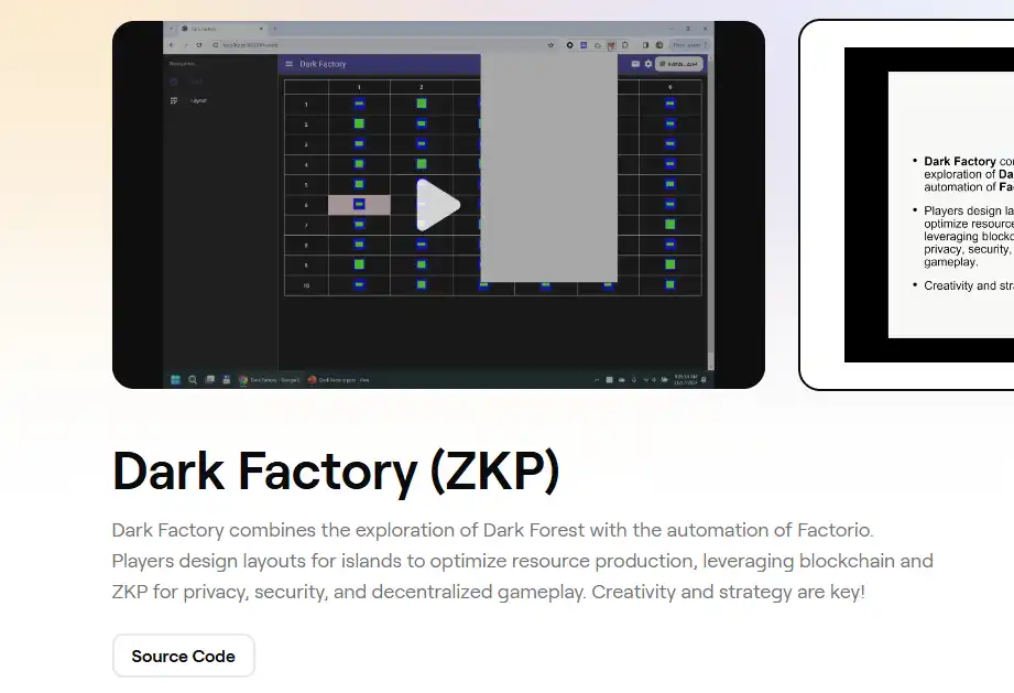 Dark Factory 是一款创新的区块链策略游戏,巧妙融合了 Dark Forest 的探索元素和 Factorio 的自动化管理特色。在 ETHGlobal Bangkok 黑客松中,项目斩获多项大奖,包括 Blockscout Explorer 大奖池奖励、Scroll 创新应用第二名以及 Polygon zkEVM 最佳零知识应用一等奖。
